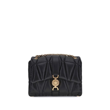 The Kleio Shoulder Bag by Versace is crafted from soft quilted lambskin, embellished with the Medusa ’95 metal detail on the front, an iconic symbol of the Maison. The metal chain shoulder strap is versatile and can be worn single or double, adding a touch of elegance. The closure is via a magnetic button, while the lined interior is organized with a patch pocket and three compartments for perfect functionality.