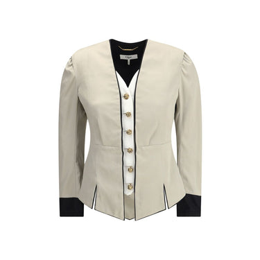 The Tailored Silk Jacket by Chloé reimagines classic elegance with refined details and a strong architectural touch. Its deep V-neckline is layered with a contrasting white placket, accentuated by gold-tone floral buttons for a luminous finish. Sharp black piping outlines the edges and cuffs, while soft pleating at the shoulders adds movement and femininity. The hemline, cut into pointed panels, enhances the design with a sophisticated, structured flair.