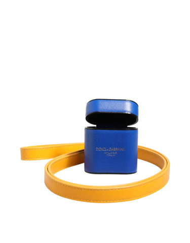 Dolce & Gabbana Blue Yellow Calfskin Leather Logo Strap Men Airpods Case