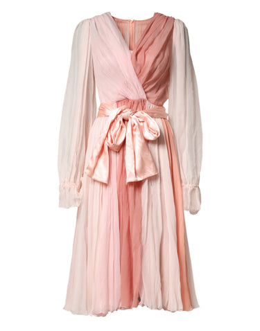 Dolce & Gabbana Pink Silk Tulle Long Sleeve V-neck Dress