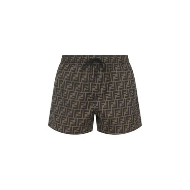 Swimwear by Fendi, elasticized waistband with adjustable drawstrings, two side welt pockets, iconic all-over contrasting repeated brand monogram.
