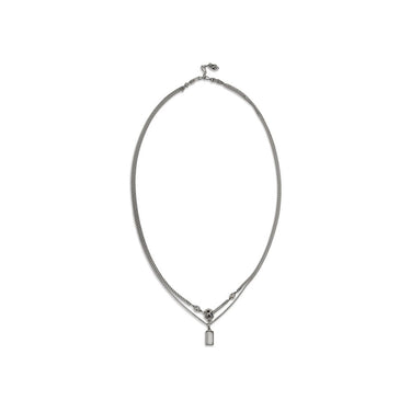 The Skull Necklace with Pendant by Alexander McQueen is a piece of jewelry with a bold and distinctive style. Made of solid-colored brass, it features a sliding pendant embellished with rhinestones and the embossed logo, a symbol of the brand’s iconic identity. The round-neck model is adjustable and closes with a practical lobster hook, combining refined design and functionality in an accessory perfect for completing bold, contemporary looks.