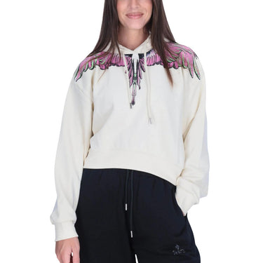 Women’s hoodie by COUNTY OF MILAN, model 25ICM30000. Crafted from 100% pure cotton, this hoodie stands out for its contemporary and original design. The graphic detail on the shoulders, featuring stylized wings in vibrant shades, adds an artistic and distinctive touch to the garment. The relaxed, slightly cropped fit offers a modern and comfortable silhouette, ideal for leisure time or completing urban chic outfits. The adjustable drawstring hood and elastic cuffs ensure practicality and comfort for any occasion.