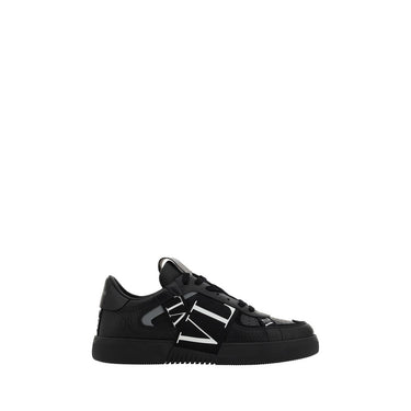 Calfskin VL7N Sneakers by Valentino Garavani, perforated round toe, flat sole, front lace-up closure, contrasting embroidered logo label on front tab, paneled design, webing bands with contrasting iconic brand monogram applied to side panels.