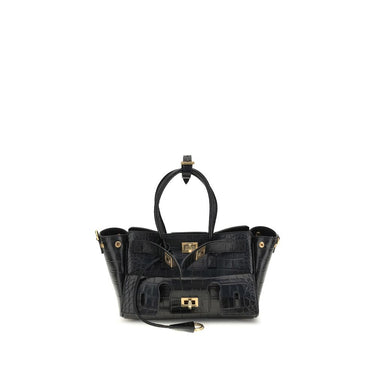 Balenciaga’s Bel Air mini Shoulder Bag is made of calfskin leather with crocodile processing, combining sophistication and iconic design. The carry-all model features two handles joined by a clip and an adjustable, removable shoulder strap, so it can be carried on the shoulder, over the shoulder or by hand. The back features the embossed Balenciaga Paris logo with lamination, while the removable key ring with double spiral loop adds practicality. Antiqued gold hardware, snap buttons on the sides, and an engraved logo swivel closure complete the look. The bag offers a large front pocket, main compartment and two interior zippered pockets for functional organization.